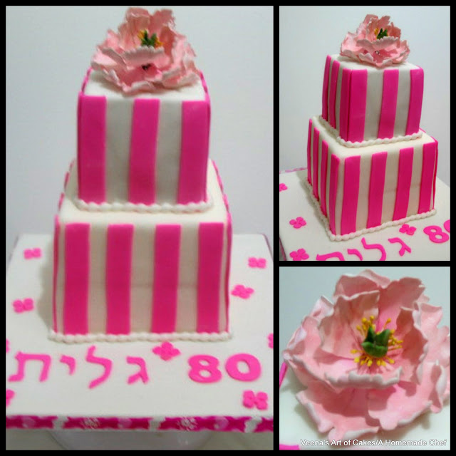 The mother use to teach dance to little girls, loves the color pink, loves flowers and her favorite dress use to be a white dress and pink bold stripes. So the daughter wanted to bring that out on the cake. I believe that dress has some fond memories attached to it. Every time the kids remember their childhood they picture her in that dress. I thought it was so sweet. So finally this is what we came up with..